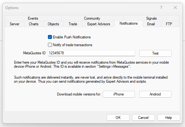 In Meta trader under Options – Notifications make sure Enable Push Notifications and MetaQuotes ID is filled in for Mobile Notification alerts