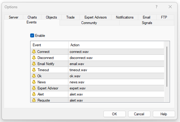 Meta trader under Options – Events make sure Enable is ticked for audio